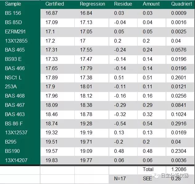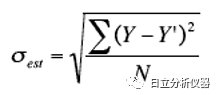 式中: σest σest 是估算標(biāo)準(zhǔn)誤差 Y是由儀器測定的實際結(jié)果 Y’是回歸分析后的結(jié)果 N是值的數(shù)量 使用一些實例能更容易明白該方法的原理。這是光譜儀的結(jié)果表。